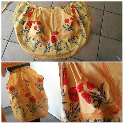 This terribly bright poppy and lavender op-shop table cloth was crying out to made into a terribly kitsch apron (or two). The table cloth was rectangular but there was an half oval design at each end, which I followed for the hem and the pockets are the corners. I'm going to make another from the other half of the table cloth for a friend.